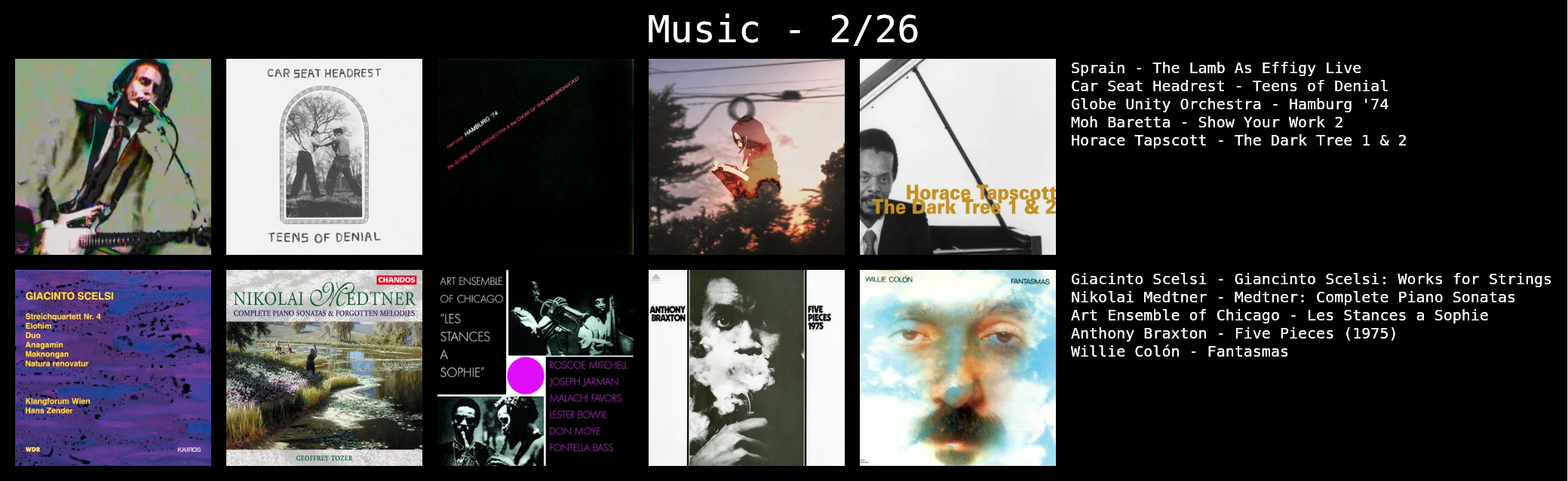 An interesting month. For much of it I was consumed with my own demonic unwillingness to live; you know, lying in bed all day lamenting being. I am thankfully out of that, although I have less music to speak of so glowingly as I did last month. Nevertheless, many interesting things.